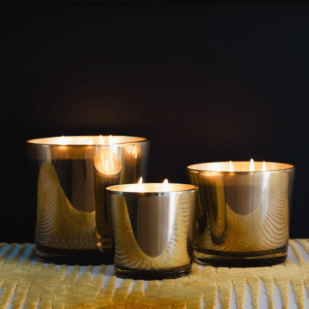 Η Χριστουγενιάτικη συλλογή μας αποτελείται από τρία μεταλλικά χρώματα -χρυσό, ασημί και χάλκινο-, με κάθε χρώμα να διαθέτει το δικό του άρωμα, σχεδιασμένα για να προσθέσουν μια νότα λάμψης σε κάθε χώρο. Έχει minimal αισθητική και το λογότυπο WAKS είναι τυπωμένο διακριτικά. Tα κεριά μας είναι χειροποίητα με φυσικό μείγμα κεριού και 100% βαμβακερό φυτίλι.